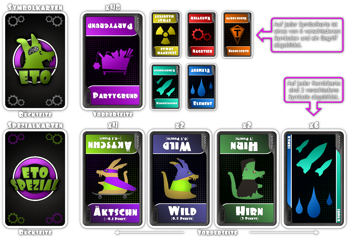 Spezialkarten stellen dich vor verschiedene Herausforderungen. Captain ETO, auf seinem super coolen Skateboard, hätte z.B. gerne etwas "Äktschn"! Je nach Spielrunde solltest du daher vielleicht dafür sorgen, nicht der Letzte zu sein, der die vier Katzen des Nachbarn rasiert oder unter den Tisch gekrabbelt ist und dann laut ETO gerufen hat...