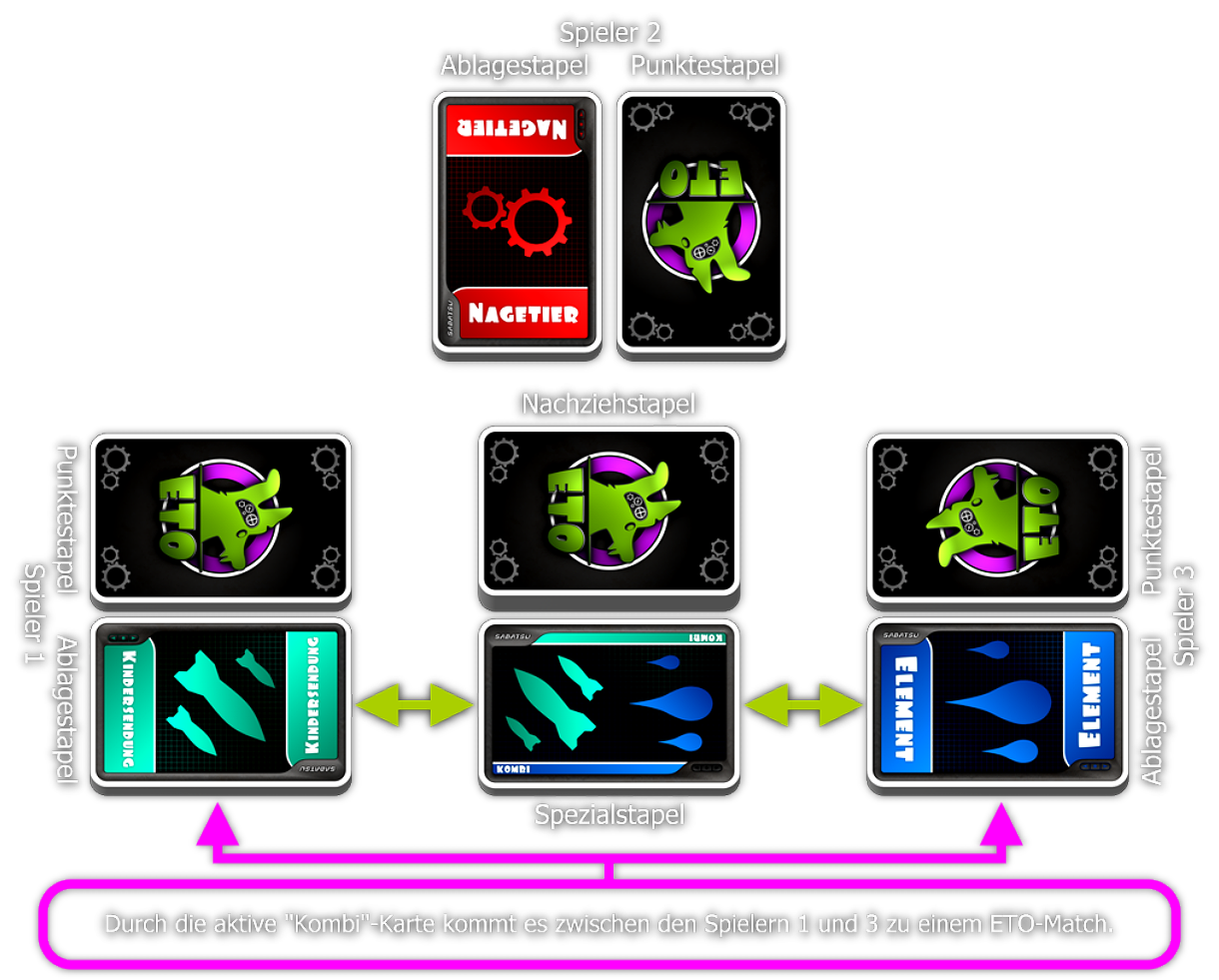 Reihenfolge: Der Spieler links des Spielers, der als letztes eine Karte aufgedeckt hat, ist nach Abschluss eines ETO-Matches bzw. einer Match-Serie oder Abhandlung einer Spezialkarte an der Reihe. Die Spielerreihenfolge ändert sich nie. (Um anzuzeigen, wer an der Reihe ist, könntet ihr im Spielverlauf z.B. einen kleinen Gegenstand, wie ein Geldstück, ein Skateboard oder den Nachbarsjungen/die Nachbarskatze reihum weitergeben.)