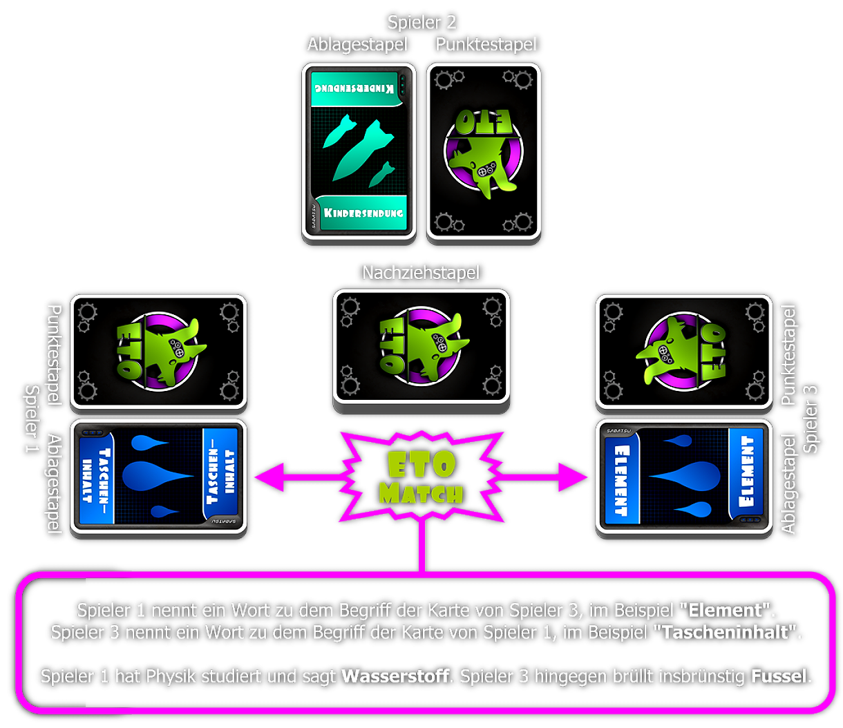 Deckt ein Spieler eine Karte auf, die ein Symbol trägt, welches auch auf einer offen liegenden Karte eines Mitspielers zu sehen ist, kommt es zwischen diesen beiden Spielern sofort zu einem ETO-Match. Die beiden an diesem epischen Wettstreit beteiligten Spieler (Es können nur zwei sein!) nennen jeder so schnell wie möglich ein Wort, das zum Begriff der Karte des Gegners passt.